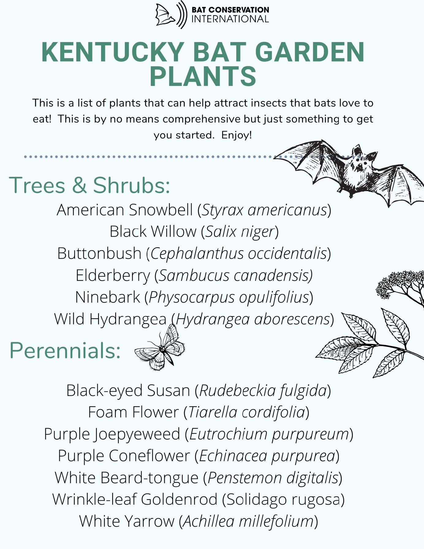 Many bats eat night-flying insects, so you’ll want to plant flowers that either stay open through the night or bloom through the evening. Use native plants that match your region and site conditions, as they have evolved to attract native insects. Remember: native plants attract native insects that in turn provide bat food! Other things to consider:
